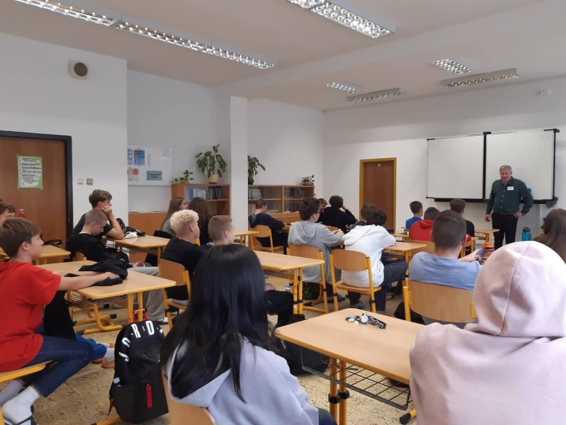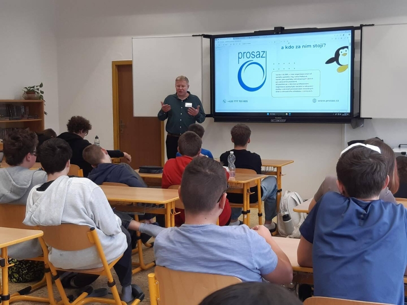 V úterý 23. září 2025 se naše osmé třídy setkaly na povídání o sociálních službách s panem Mgr. Vítem Čapkem z organizace Prosaz, pro kterou letos budou žáci v neděli 28. září prodávat své výrobky před radnicí Prahy 13 na Svatováclavských trzích. Pan Čapek, jako vedoucí pečovatelské služby, žákům objasnil, jaké mají jejich klienti potíže v běžném životě a jakými všemi způsoby jim organizace Prosaz pomáhá. Žáci byli překvapeni, jak náročná je sociální péče pro klienty a i pro poskytovatele. Jako škola se těšíme na další spolupráci a vždy rádi podpoříme správnou věc.