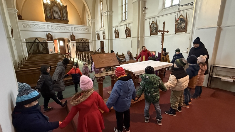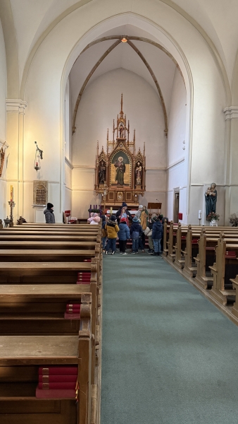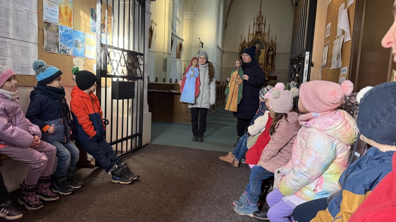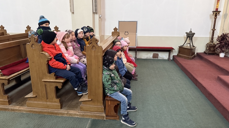 V krásném a klidném prostředí kostela jsme si vyslechli poutavé vyprávění o narození Ježíška. Dozvěděli jsme se příběh o Marii a Josefovi, kteří se vydali na dlouhou a náročnou pouť. Cestou hledali místo k přenocování, ale v každé krčmě je odmítali, až nakonec našli skromný azyl ve chlévě, kde se Ježíšek narodil.
