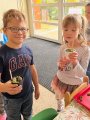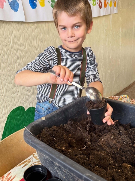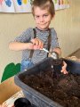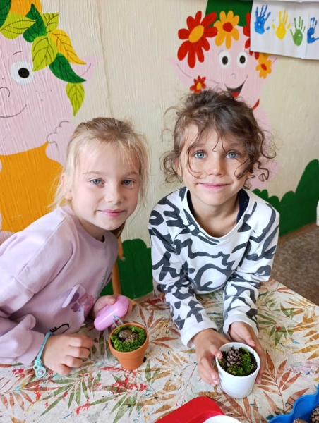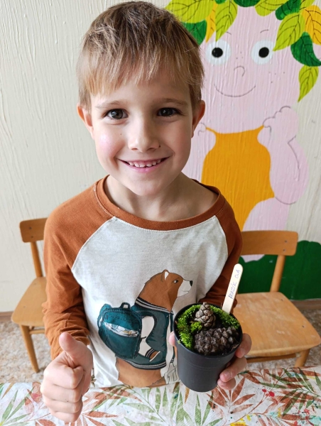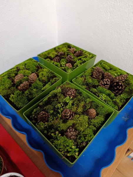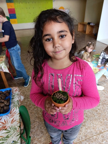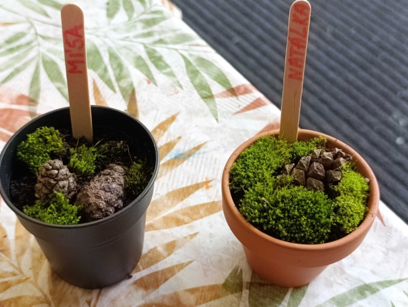 A protože víme, že i malý člověk může udělat velkou věc, rozhodli jsme se zasadit šišky, které jsme předtím našli při procházce lesem. Každé dítě si naplnilo svůj květináček hlínou, do ní pečlivě vložilo šišku a vše ozdobilo kouskem mechu – aby to vypadalo jako opravdový les v malém.